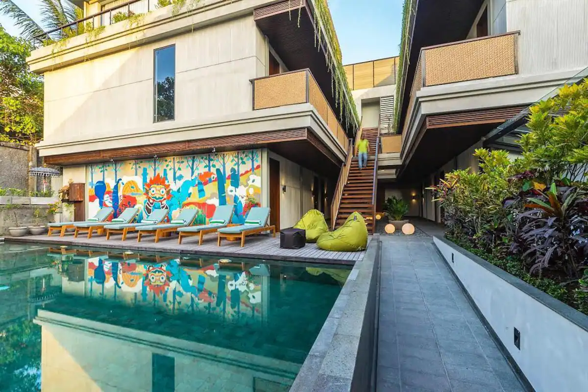 From the heart of Ubud, a modern two stories concrete merge seamlessly with the lush surroundings. Brushed by Bali’s notable emerging contemporary artists, Our Hotel is becoming more alive with its curated artworks and also from the lively Flock Restaurant & Bar – Ubud residing just next to the hotel. Breathe some fresh morning air and stroll to Monkey Forest or Traditional Art Market in just less than 10 minutes walk.