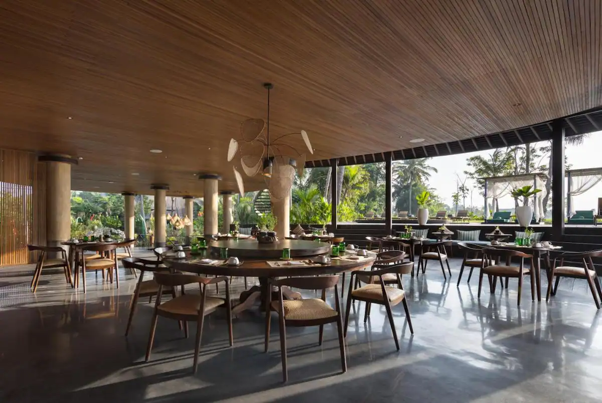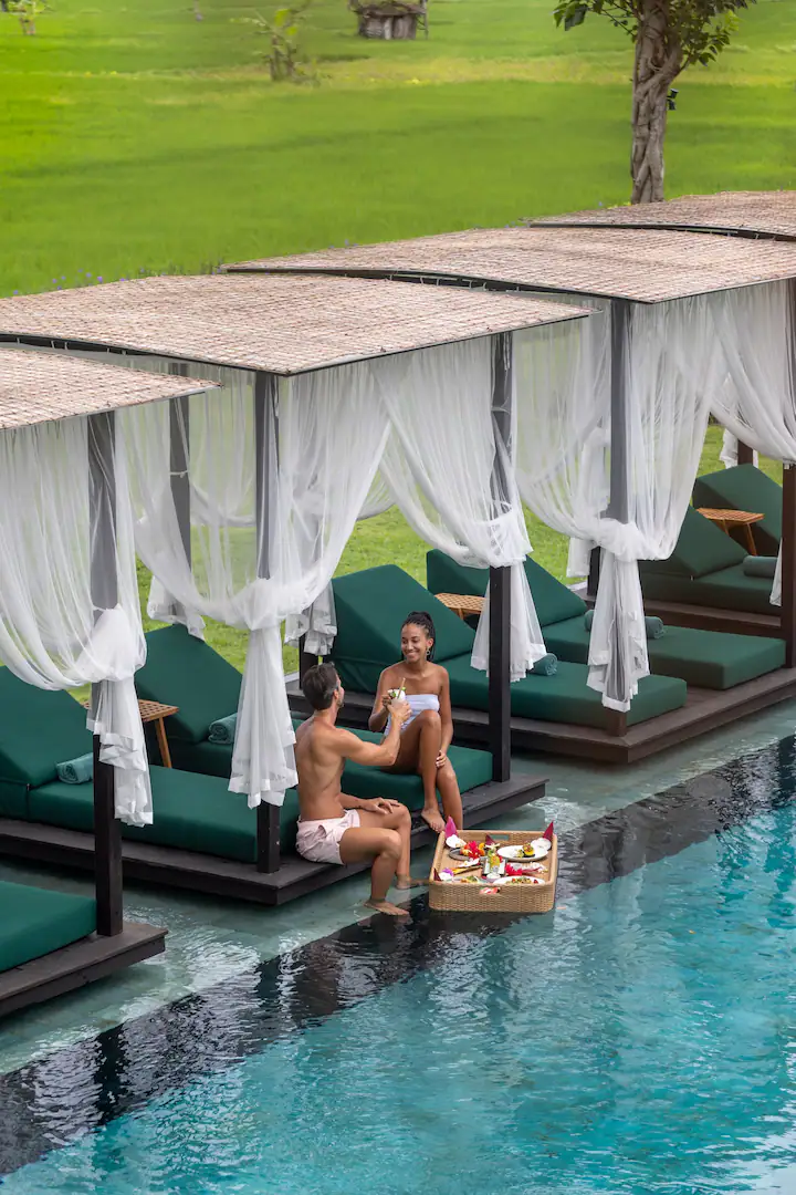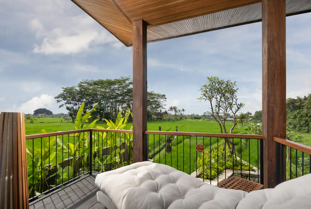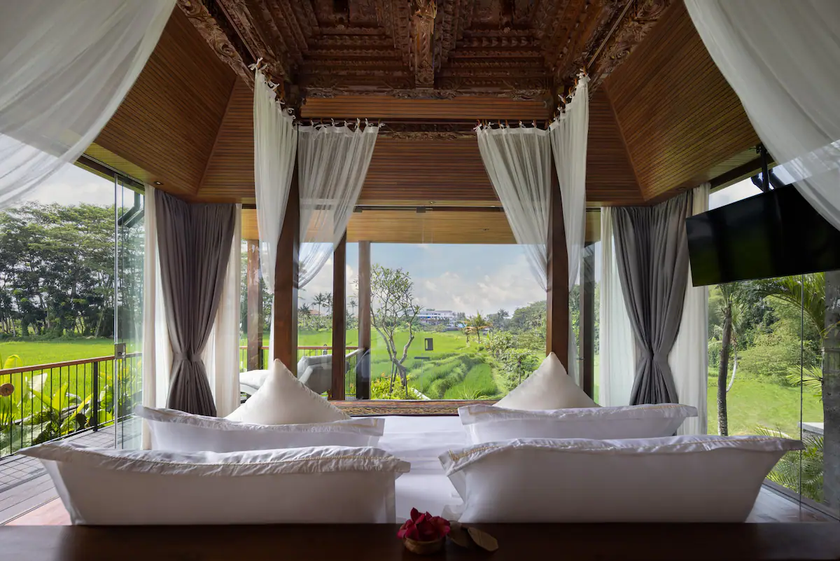 Upstairs, premium super king-sized beds nestle amidst lavish surroundings. Under beautifully designed vaulted ceilings, guests can unwind in the sumptuous ambience, with almost 360-degree views of the rice paddies and jungles beyond.