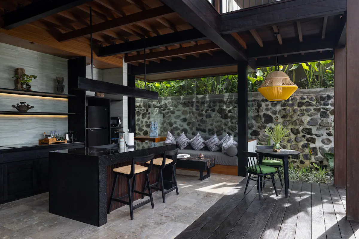 A striking glass-wood-stone structure, each villa feature elements inspired by traditional Indonesian homes from across the archipelago, a nod to the regal Javanese joglo with its uniquely distinct roofs and the Malay traditional houses of Sumatra with their tall stilts and imposing pillars.
