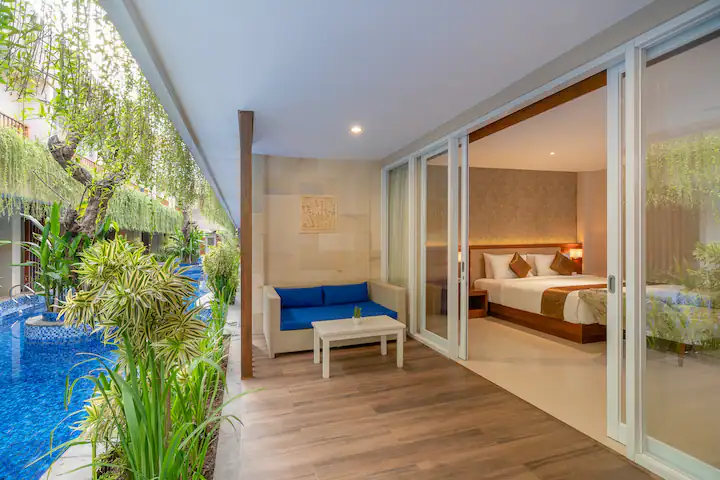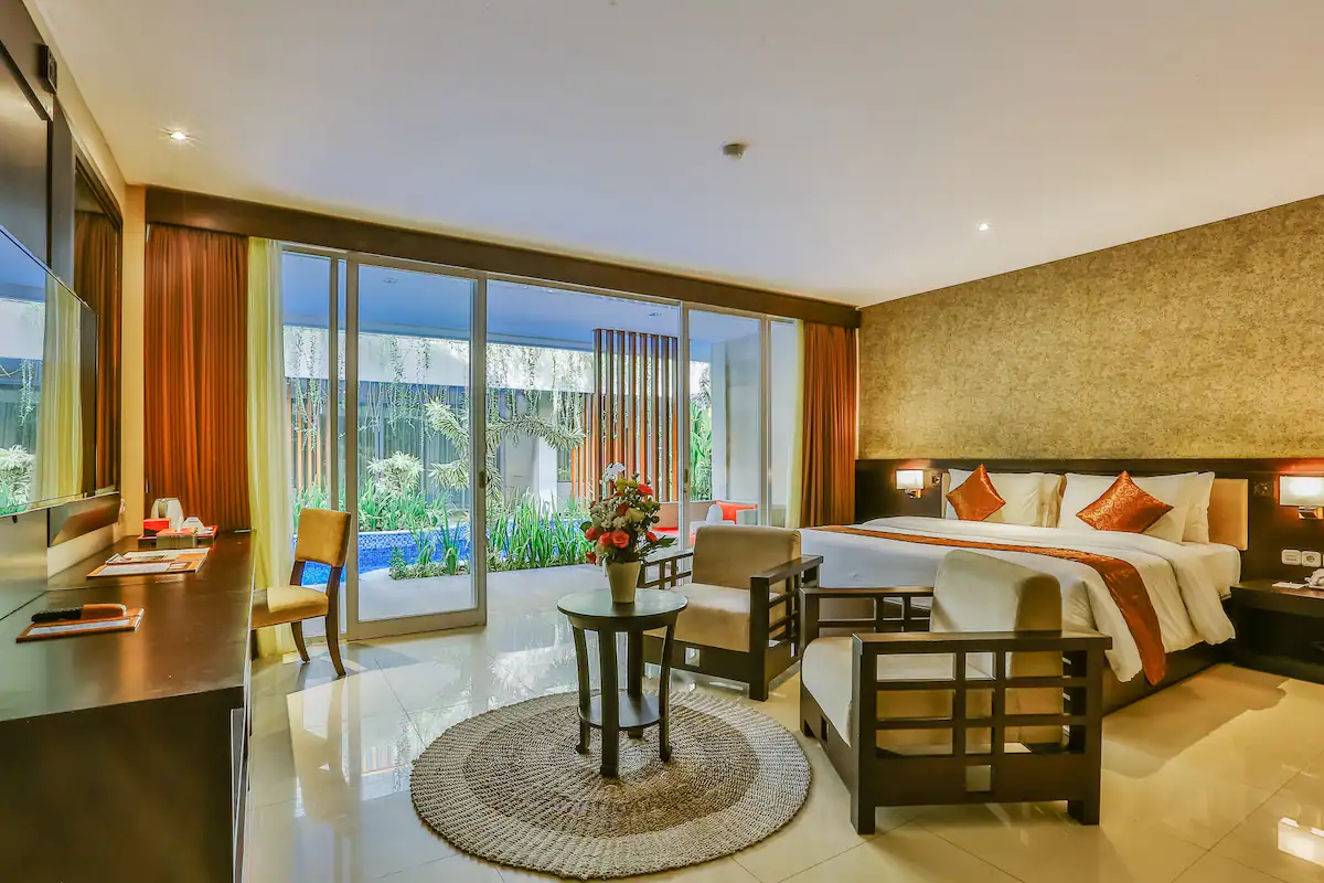 Offering direct access to the pool, this spacious suite is fitted with a flat-screen TV, a personal safe, an electric kettle and a mini-bar. Private bathroom has a separate bath and shower, as well as free toiletries.