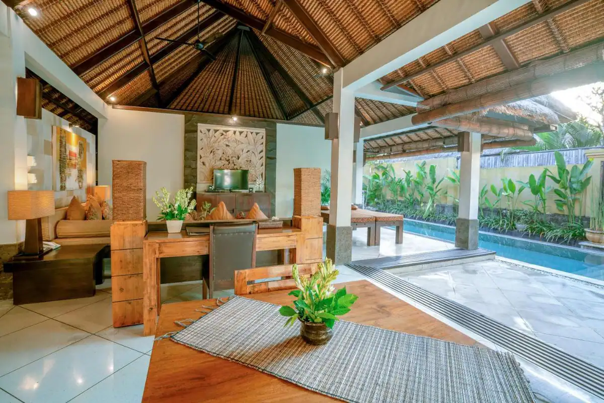 We are villa complex. By the time you reach your villa, our Balinese sculptures will warmly welcome you with their smile and kind gestures. Pass through the typical Balinese-style doors (Angkul-Angkul) to get into your villa, and indulge your best and unforgettable experience on vacation in Bali. From sun-basking in the garden, a dip in our private pool or a sunset stroll with bicycle around Seminyak Area, there is a lot for everyone to make the most of your time in the Bali